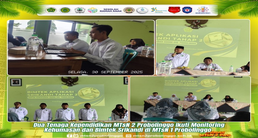 Probolinggo 30 September 2025 — MTsN 2 Probolinggo terus berkomitmen meningkatkan kualitas layanan pendidikan, tidak hanya dari sisi akademik, tetapi juga dari bidang kehumasan dan pengelolaan administrasi. Hal itu ditunjukkan dengan keikutsertaan dua tenaga kependidikan dalam kegiatan Monitoring Kehumasan dan Bimbingan Teknis Srikandi yang dilaksanakan pada Selasa, 30 September 2025 di MTsN 1 Probolinggo.