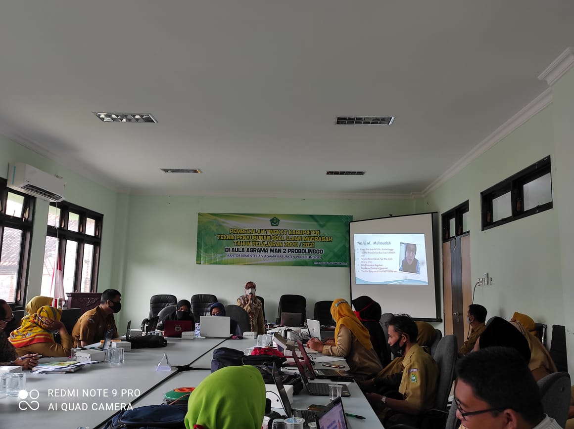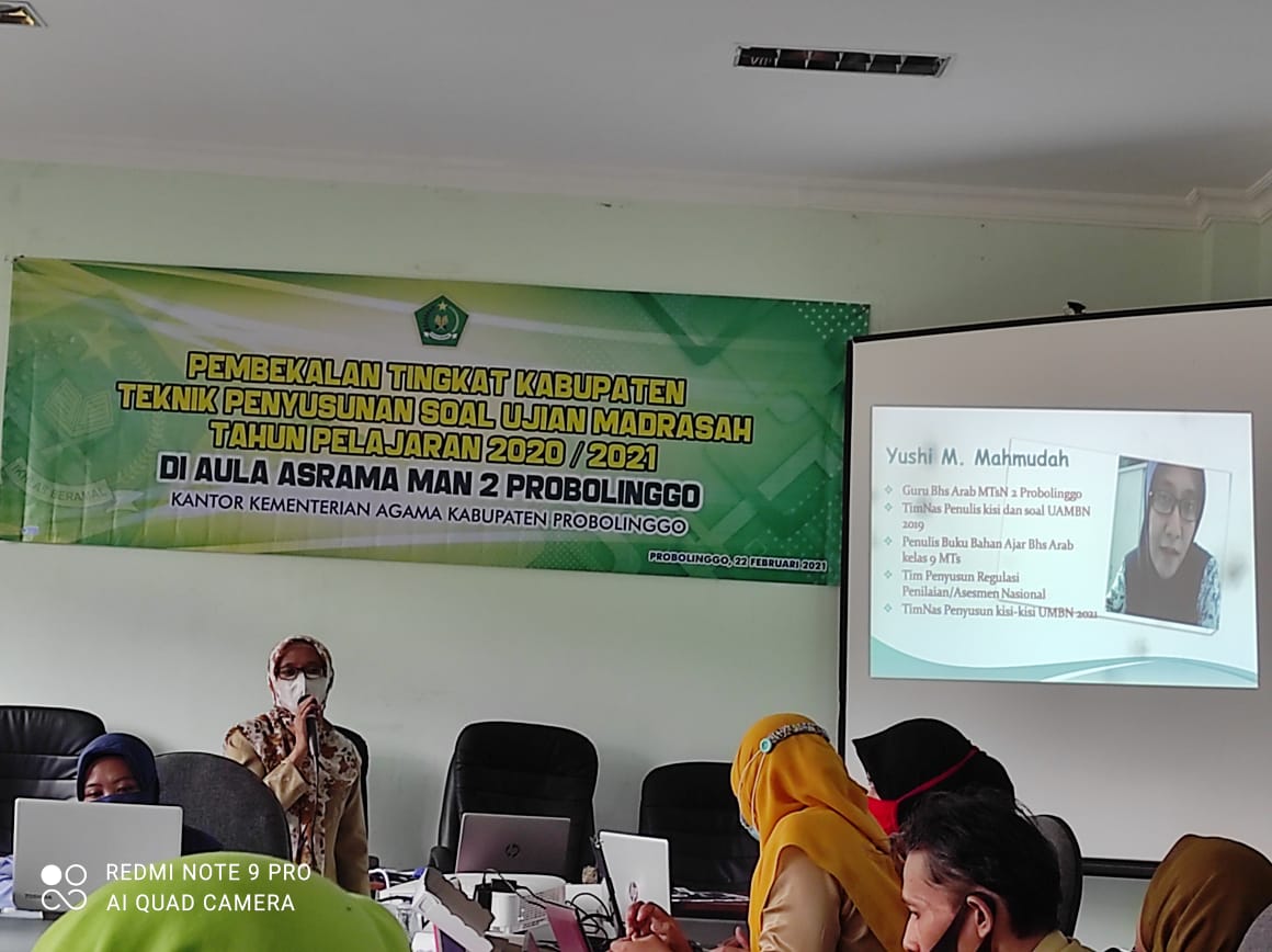 Kegiatan bertajuk " Pembekalan Teknik Penyusunan Soal Ujian Madrasah Tingkat Kabupaten" diselenggarakan oleh Kementerian Agama Kabupaten Probolinggo bertempat di Aula Asrama MAN 2 Probolinggo. Dihadiri oleh Bapak Kepala Kantor Kemenag Kab Probolinggo beserta Bapak Kasi Pendma. Kegiatan ini diselenggarakan pada Senin, 22 Pebruari 2021 pukul 10.00 WIB. Adapun peserta pada kegiatan tersebut merupakan guru MI, MTs, dan MA pada KKM masing-masing. Kegiatan tersebut juga dihadiri oleh beberapa pengawas yang ditunjuk sebagai pendamping kegiatan. Yushi Mukhlishatul Mahmudah, Guru Bahasa Arab di MTs Negeri 2 Probolinggo didapuk menjadi Salah satu narasumber dalam kegiatan tersebut . Beliau merupakan guru yang 2 tahun berturut-turut mewakili Jawa Timur sebagai anggota Tim Nasional Penyusun kisi-kisi soal Ujian Madrasah tahun 2021. Beliau membagi pengalamannya, membagi ilmu yang ia dapat setelah melaksanakan Diklat Penyusunan Regulasi Penilaian Nasional pada 6-7 Februari 2021 di malang, dan Penyusunan kisi-kisi UMBN PAI dan Bahasa Arab pada 9-11 Februari 2021 di Yogyakarta.