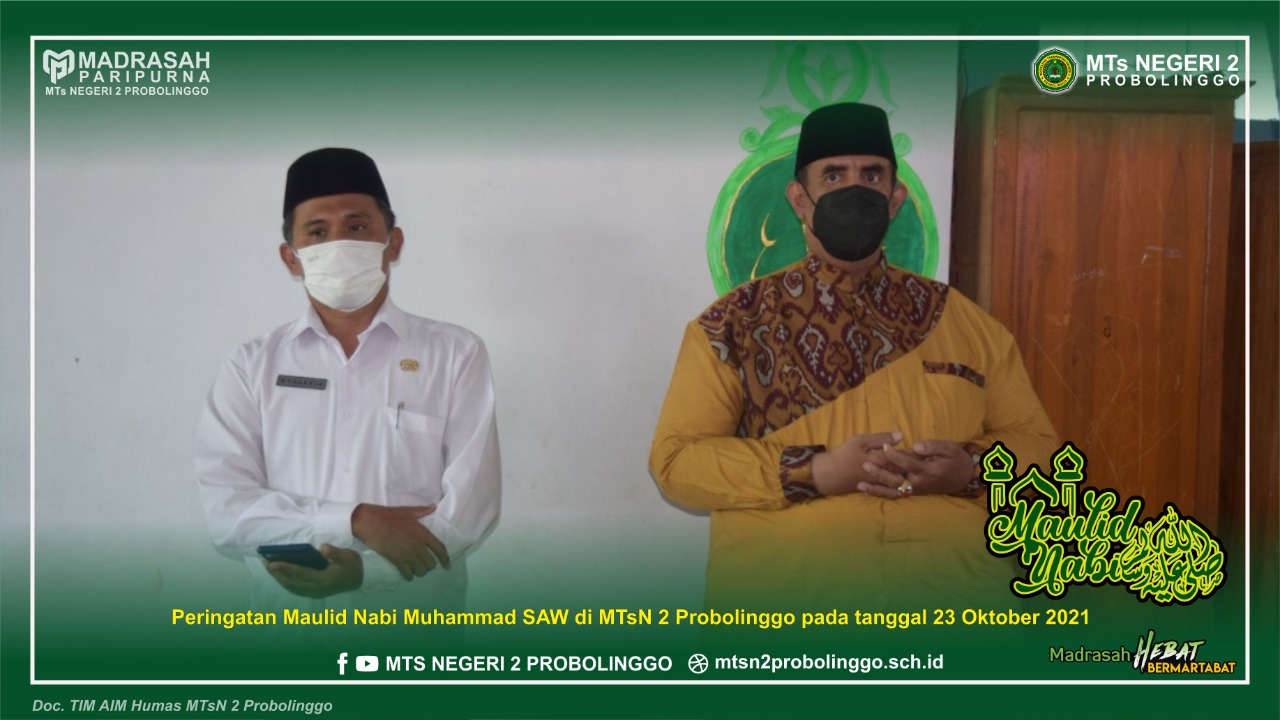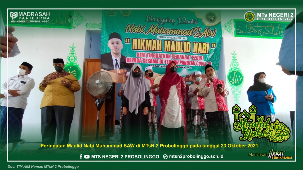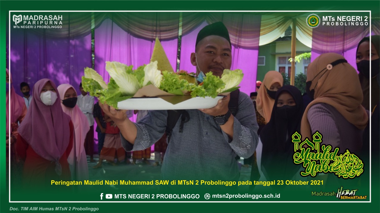 Dalam rangka meningkatkan Rasa Cinta terhadap Nabi Muhammad Saw, Madrasah Tsanawiyah Negeri 2 Probolinggo menggelar Peringatan Maulid Nabi, pada hari Sabtu, 23 Oktober 2021. Acara tersebut digelar di Musholla Lokal Utara diikuti oleh seluruh keluarga besar MTs Negeri 2 Probolinggo dengan tetap mematuhi protokol kesehatan.